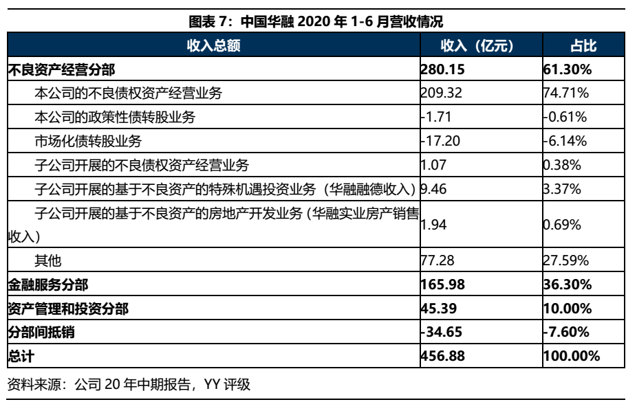 公司營(yíng)收主要來(lái)自不良資產(chǎn)經(jīng)營(yíng)業(yè)務(wù)和金融服務(wù)業(yè)務(wù),20年1-6月分別實(shí)現(xiàn)營(yíng)收280.15億元和165.98億元,營(yíng)收占比61.30%和36.30%。不良資產(chǎn)經(jīng)營(yíng)業(yè)務(wù)中本公司的不良債權(quán)資產(chǎn)經(jīng)營(yíng)業(yè)務(wù)是主要營(yíng)收來(lái)源,子公司不良資產(chǎn)業(yè)務(wù)營(yíng)收貢獻(xiàn)較少。