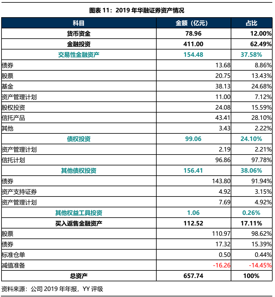 華融證券2019年資產(chǎn)合計(jì)657.74億元,以貨幣資金,金融投資和買(mǎi)入返售金融資產(chǎn)為主,從細(xì)分科目來(lái)看,公司資產(chǎn)主要投向債券、股票和信托等資產(chǎn)。