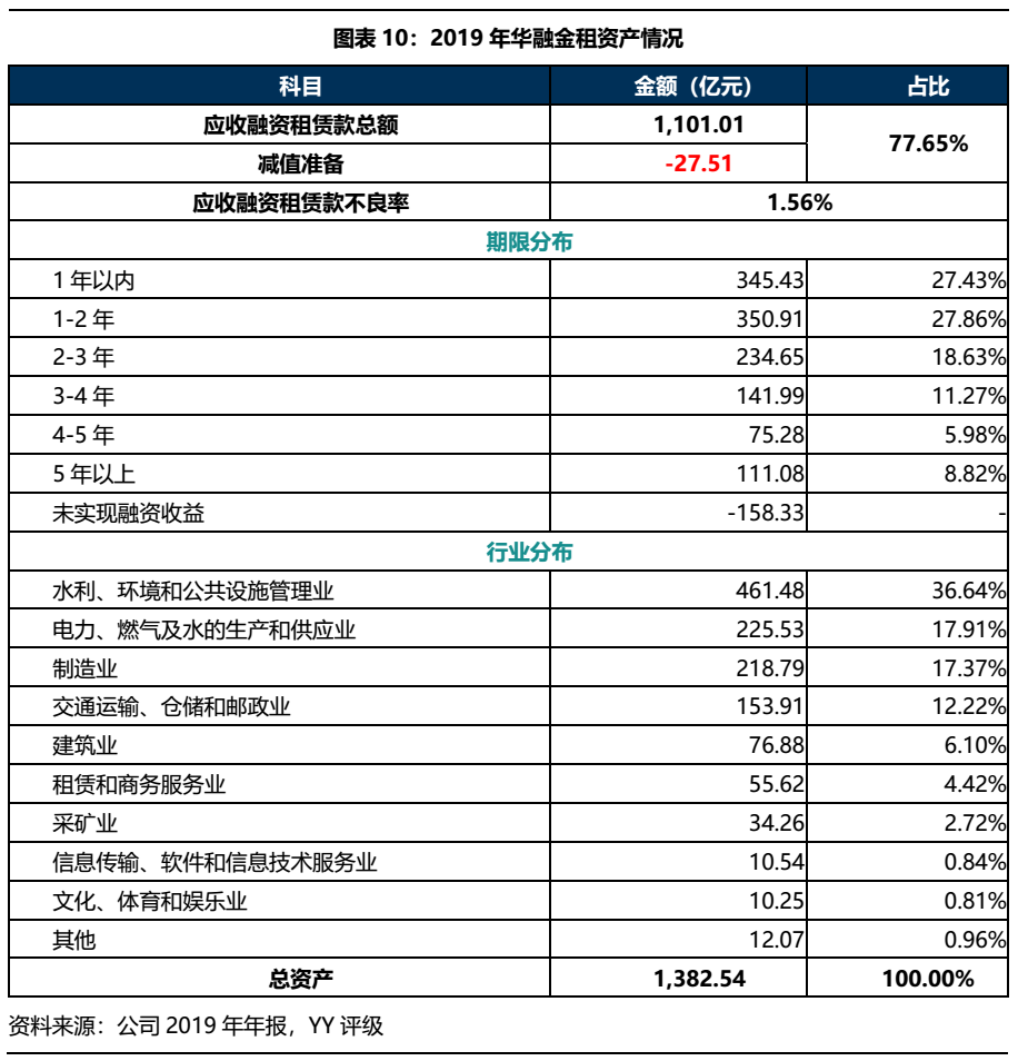 華融金租2019年資產(chǎn)總計(jì)1,382.54億元,主要為應(yīng)收融資租賃款,其中應(yīng)收融資租賃款不良率1.56%,較上年上升0.07%。從期限來(lái)看,公司應(yīng)收融資租賃款以3年內(nèi)為主,其中1年內(nèi)應(yīng)收融資租賃款占比27.43%,3年以上占比26.07%;行業(yè)來(lái)看主要集中在水利、環(huán)境和公共設(shè)施管理業(yè),電力、燃?xì)饧八纳a(chǎn)和供應(yīng)業(yè),制造業(yè)和交通運(yùn)輸、倉(cāng)儲(chǔ)和郵政業(yè)等。