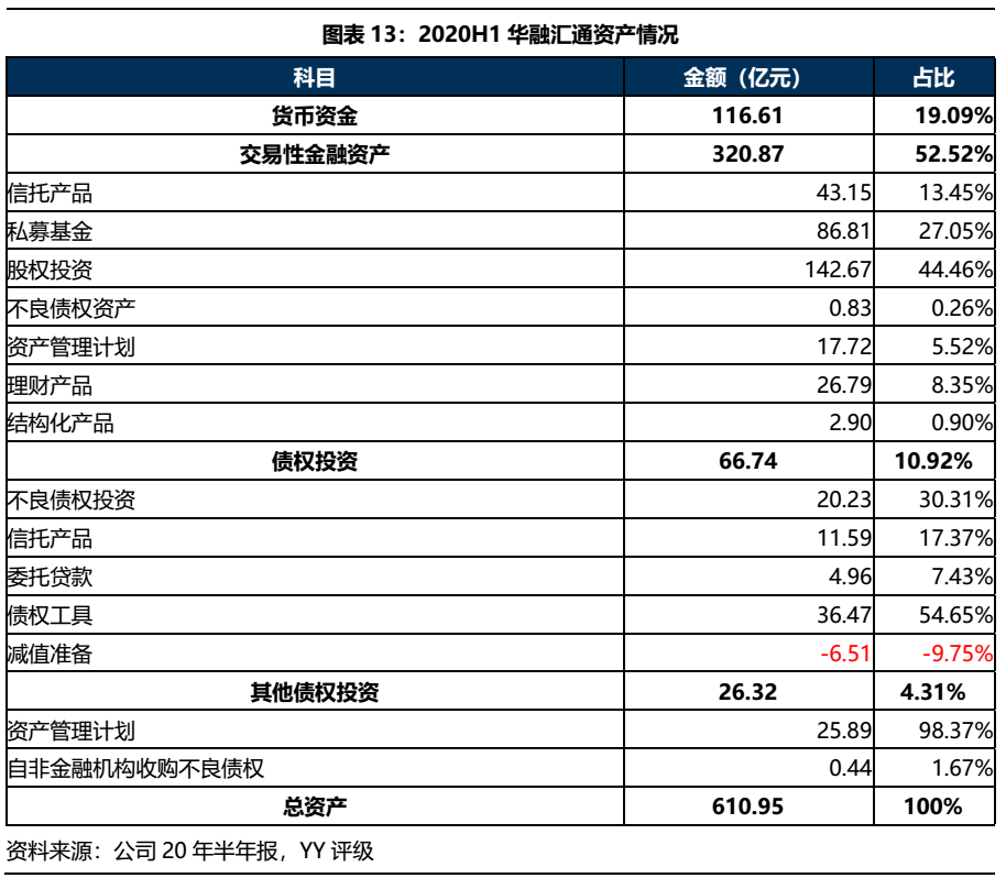 由于不再并表華融晉商,華融匯通資產(chǎn)規(guī)模2019年以來(lái)大幅下降,2020年6月末,公司總資產(chǎn)610.95億元,相較2018年總資產(chǎn)規(guī)模(1155.45億)近乎腰斬。從資產(chǎn)構(gòu)成來(lái)看,華融匯通資產(chǎn)以貨幣資金、交易性金融資產(chǎn)和債權(quán)投資為主,交易性金融資產(chǎn)主要投向股權(quán)、私募基金和信托產(chǎn)品;債權(quán)投資則以債權(quán)工具、不良債權(quán)投資及其他權(quán)益投資的資產(chǎn)管理計(jì)劃為主,整體以投資類(lèi)資產(chǎn)為主,需關(guān)注投資風(fēng)險(xiǎn)。