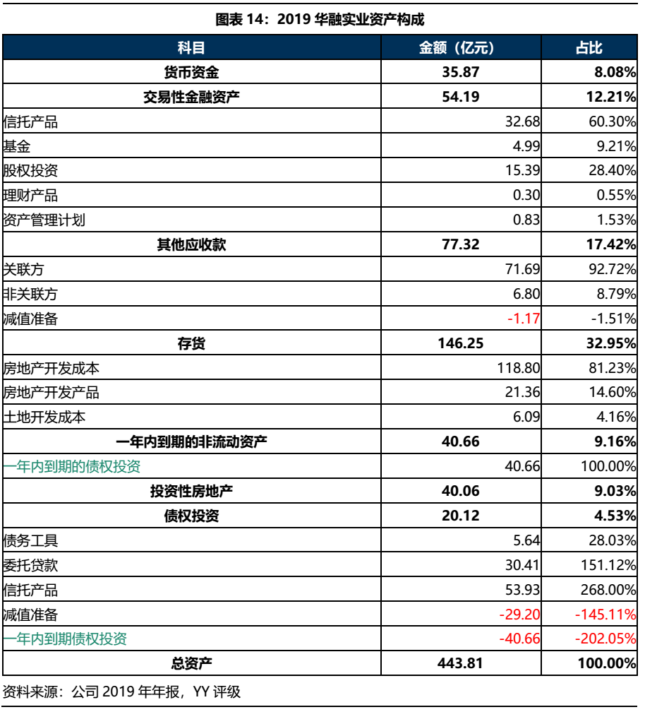 華融實(shí)業(yè)2019年資產(chǎn)合計(jì)443.81億元,主要為存貨、其他應(yīng)收款、交易性金融資產(chǎn)、一年內(nèi)到期的非流動(dòng)資產(chǎn)、貨幣資金、投資性房地產(chǎn)和債權(quán)投資,由于不再并表華融國(guó)際,資產(chǎn)規(guī)模相較于2018年的2,569.68億元大幅下降。