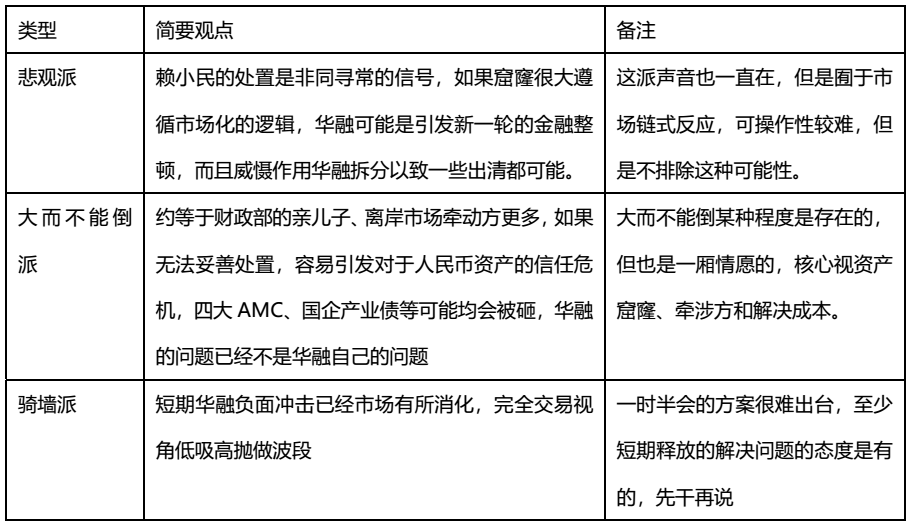 現(xiàn)在到了算大賬,清點(diǎn)代價(jià)的時(shí)候,華融到底是整體資產(chǎn)包打包處置,還是拆著賣(mài),債到底隨資產(chǎn)走,還是先把網(wǎng)狀的債務(wù)割開(kāi)成為一個(gè)個(gè)線(xiàn)性的各個(gè)擊破、甚至還有投資者在默默祈禱能不能先把資本市場(chǎng)的兌付了剩下該干啥干啥。