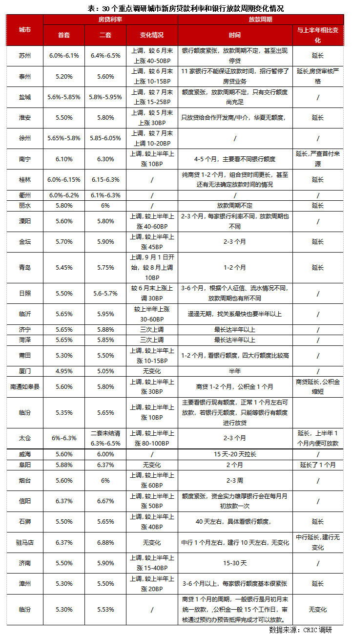自年初央行推出房地產(chǎn)貸款集中度管理制度以來,各地“上行下效”,捂緊錢袋子,也出現(xiàn)了房貸額度緊張、放款周期拉長、貸款利率上調(diào)等現(xiàn)象。不過近期市場傳聞,下半年貨幣政策將向?qū)捫庞棉D(zhuǎn)向,推動銀行加碼信貸投放,部分銀行已接到窗口指導加大8月末的信貸投放,如若傳聞屬實,勢必會帶動社會融資規(guī)模總量穩(wěn)步回升,對地產(chǎn)行業(yè)是否也存在一定的利好刺激?帶著這樣的疑問,我們于近期調(diào)研了30個重點城市的房貸利率和回款周期變動情況。