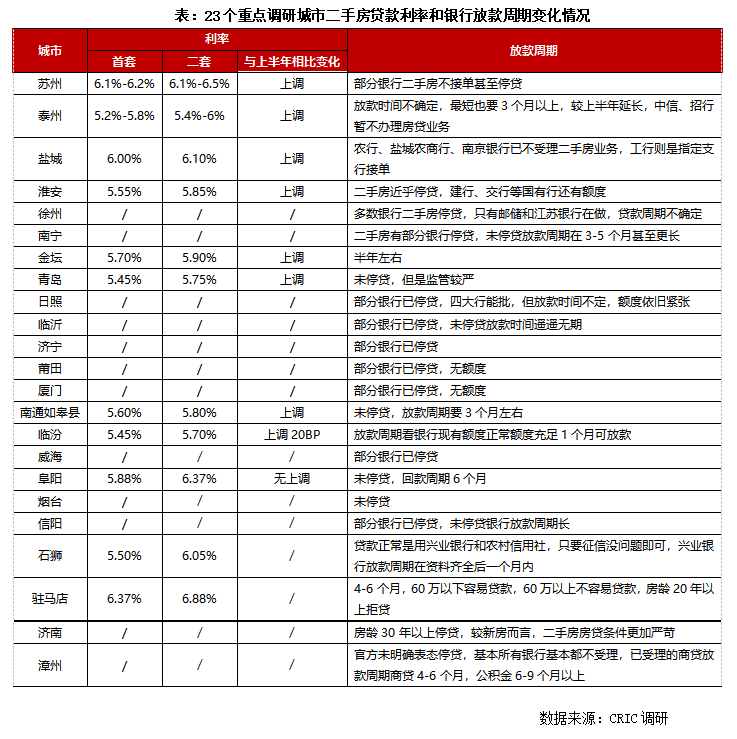 我們調(diào)研的23城中有6成以上銀行已經(jīng)出現(xiàn)了二手房停貸現(xiàn)象或是放款時間遙遙無期。即便是尚未停貸城市,多數(shù)放款周期也在3-6個月,較上半年有不同程度的延長,同時銀行方面也加強了貸款監(jiān)管,關(guān)于貸款額度,抵押房屋的房齡等都有明確要求,整體二手房的貸款難度還是要大于新房貸款的。