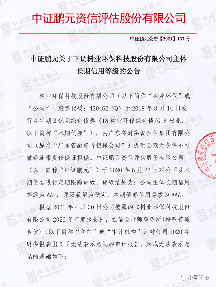 5月14日,中證鵬元公告稱,將樹業環保科技股份有限公司(以下簡稱“樹業環保”)主體長期信用等級由AA-下調為A,評級展望由穩定調整為負面。