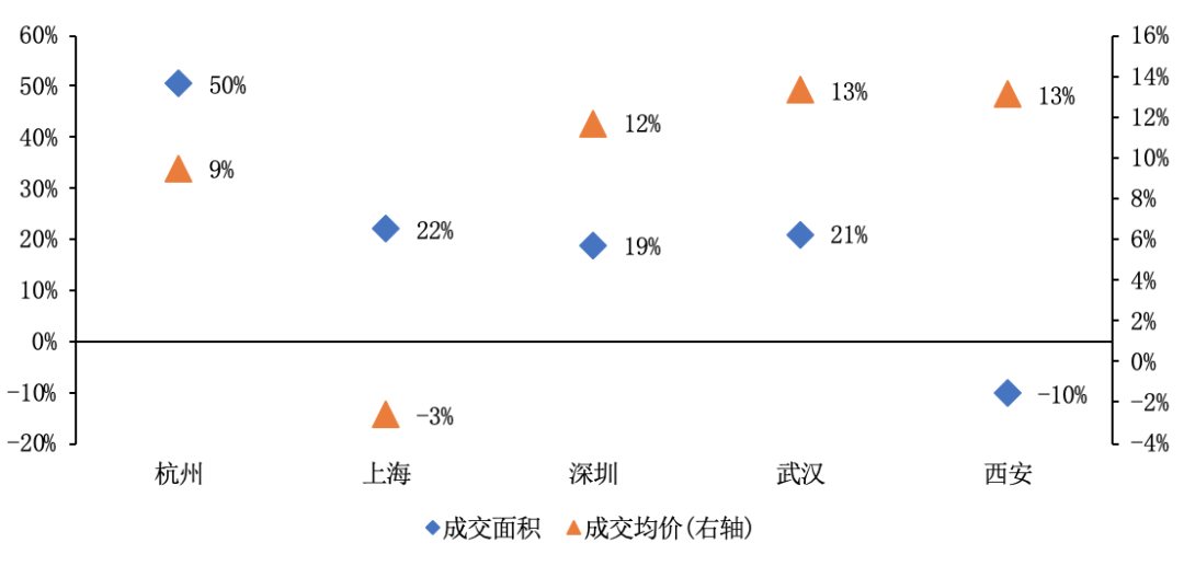 部分區域土地供應受限導致稀缺宅地價格走高,區域地價高漲帶動新房高熱。上海最為顯著,嘉定、閔行、楊浦和青浦四區地價同比漲幅超40%,房價同比漲幅則均超10%,其中嘉定房價同比增29%,即使有集中供應對區域均價的攤薄也收效不佳。諸如此類地,杭州臨安區、武漢江岸區、西安高新區地價同比增速均超30%。從市場表現來看,上述幾區軍事樓市熱度最高的區域,出現了“萬人搖”等一房難求現象。