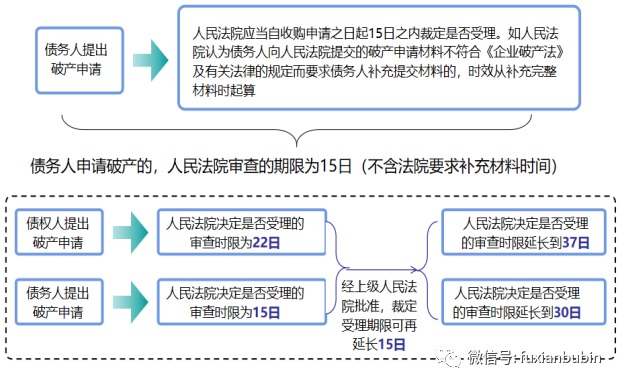 另外如遇到特殊情況,經(jīng)上級人民法院批準(zhǔn),人民法院裁定受理的期限可延長到15日,即如果是債權(quán)人申請破產(chǎn),人民法院審查的最長期限為37日,如是債務(wù)人,負(fù)有清算責(zé)任人的申請批次,人民發(fā)運審查的最長期限為30日。