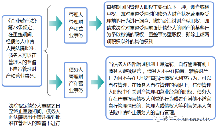 根據(jù)《企業(yè)破產(chǎn)法》第42條、73條、75條、76條、77條;《司法解釋(三)》第2條、5條、15條;參照北京市高級人民法院《企業(yè)破產(chǎn)案件審理規(guī)程》第205條規(guī)定,破產(chǎn)重整期間相關(guān)權(quán)利主要集中在如下幾項:一是重整期間經(jīng)營管理權(quán)限回歸。經(jīng)債務(wù)人申請,人們法院批準(zhǔn),債務(wù)人可以在管理人監(jiān)督下自行管理財產(chǎn)和營業(yè)事務(wù);管理人經(jīng)申請后應(yīng)移交所管理的財產(chǎn)和營業(yè)事務(wù)。