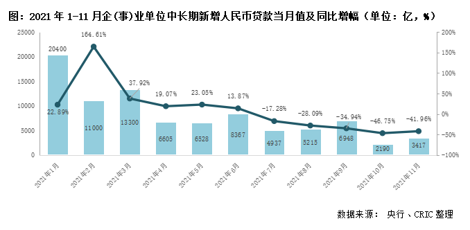 居民貸款已經(jīng)有所放松,但企業(yè)層面回暖尚早。11月社會(huì)融資規(guī)模數(shù)據(jù)顯示,11月企事業(yè)單位中長(zhǎng)期貸款新增3417億元,同比減少41.96%,維持7月以來(lái)的負(fù)增長(zhǎng)狀態(tài),企業(yè)端貸款融資承壓。