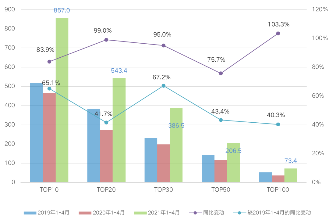 2021年1-4月,各梯隊房企銷售門檻繼續(xù)提升,相較去年和2019年同期均有明顯增幅。其中,TOP10房企銷售操盤金額門檻為857億元,較2019年同期增長65.1%,龍頭房企保持規(guī)模優(yōu)勢。