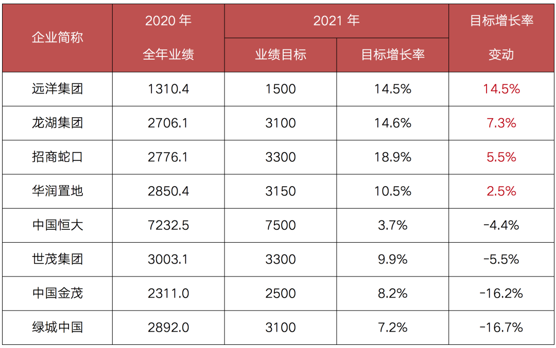 “房住不炒”長效機制下,調控收緊仍是主旋律,疊加“三道紅線”新規(guī),在市場下行壓力下行業(yè)整體規(guī)模增速放緩,企業(yè)控負債、降杠桿壓力增加。預計隨著房企投資和規(guī)模擴張動能的降低,未來規(guī)模房企增速放緩將成為常態(tài)。規(guī)模房企的業(yè)績目標制定會更趨謹慎,整體的目標增長率也將趨于平穩(wěn)。