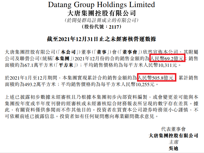 我們都說2021下半年房地產(chǎn)慘,但是對比起來,大唐集團(tuán)控股的2021年12月似乎表現(xiàn)不錯(cuò)。