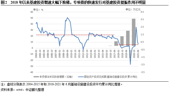 2004年以來,我國基建投資增速波動雖然較大,但整體保持較高速度增長,2004-2017年增長中樞達21.95%。受淡化GDP激勵機制、財政約束增大及城投債務融資管控等因素影響,2018年以來我國基建投資增速快速下滑,2018年至2021年6月基建投資增速中樞僅為3.47%。2018年7月,國務院常務會議提出加快1.35萬億專項債發(fā)行和使用進度,更好地發(fā)揮專項債券對穩(wěn)投資、擴內需、補短板的作用,在推動在建基礎設施項目上早見成效。2018年以來,我國新增專項債限額和實際新增專項債規(guī)模逐年提高,受疫情影響提振經濟的需求,2020年專項債計劃新增限額3.75萬億元,實際新增3.60萬億元,但基建投資增速的仍持續(xù)低位運行( 2021年上半年基建投資增速大幅反彈主要是受基數(shù)影響,2021年6月基建投資累計增速已下滑至7.15%)。