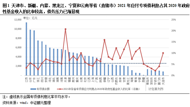 截至2021年8月10日,我國地方專項債余額約14.50萬億,占地方政府債券余額總量的52.19%,專項債余額排名靠前的省份包括江蘇省、山東省、廣東省、浙江省和四川省。根據(jù)各省專項債存續(xù)規(guī)模及發(fā)行利率來測算2021年專項債應付利息規(guī)模,其占各省2020年政府性基金收入的比率(下文統(tǒng)稱“專項債利息比率”)來看,天津市的專項債利息比率超過20%,斷層高于其他省份(直轄市),2020年天津市土地出讓收入大幅下滑,使得政府性基金收入同比下降36.3%,但即使按三年平均政府性基金收入來計算,天津市專項債利息比率仍超過16%,仍處于較高水平;第二梯隊包括新疆、黑龍江、寧夏、內蒙、甘肅、青海、云南和計劃單列市中的大連市,專項債利息比率介于10%-20%之間。