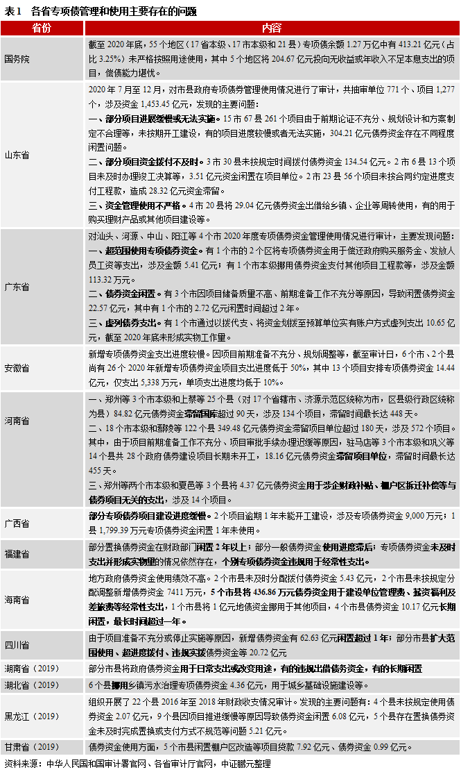 今年6月7日,審計署發(fā)布《國務院關于2020年度中央預算執(zhí)行和其他財政收支的審計工作報告》,其中對政府債務風險審計調查情況指出,政府專項債仍存在重發(fā)行、輕管理的問題。今年7月以來,各省陸續(xù)發(fā)布2020年度省級預算執(zhí)行和其他財政收支的審計工作報告,多個省份披露了2020年其專項債使用存在的問題,主要包括如下方面:(1)資金管理使用不嚴格,部分地區(qū)將專項債資金用于發(fā)放人員工資、差旅費等經常性支出,或者購買理財、出借其他單位及用作其他項目建設等;(2)專項債項目建設進度緩慢,部分項目甚至無法實施,部分專項債資金用于投向無收益的項目;(3)債券資金長期閑置,因項目前期準備不充分、規(guī)劃調整等,部分債券資金長期閑置在國庫或者項目單位,最長閑置時間甚至超過1年,未及時形成實物工作量。