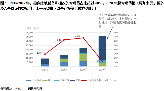 第一個方面是,2017年政策鼓勵地方政府積極探索有一定收益的公益性事業(yè)領域放行專項債券,同年6月和7月分別發(fā)布土地儲備和收費公路專項債的管理辦法;2018年4月,財政部新增棚改專項債管理辦法,自此土地儲備和棚改成為專項債的主要投向。經統(tǒng)計,2018-2019年合計投向土地儲備和棚改的專項債規(guī)模均超過當年新增專項債總額的60%,由于土地儲備和棚戶區(qū)改造的相關投資并不計入基建投資,使得專項債發(fā)行規(guī)模的快速提升并未帶動基建投資的增長。2019年9月,國務院常務會議明確“專項債資金不得用于土地儲備和房地產相關領域、置換債務以及可完全商業(yè)化運作的產業(yè)項目”,但此時2019年專項債發(fā)行已接近尾期,投向未受到影響,但2020年投向土地儲備的專項債驟降至0,投向棚改項目的專項債規(guī)模亦大幅減少,占當年新增專項債的12%左右,更多項目投入交通基礎設施建設、產業(yè)園區(qū)建設、新基建、生態(tài)環(huán)保、水利建設和軌道交通等領域。至此,專項債投資領域呈現(xiàn)多元化且真正投入各類基建項目。