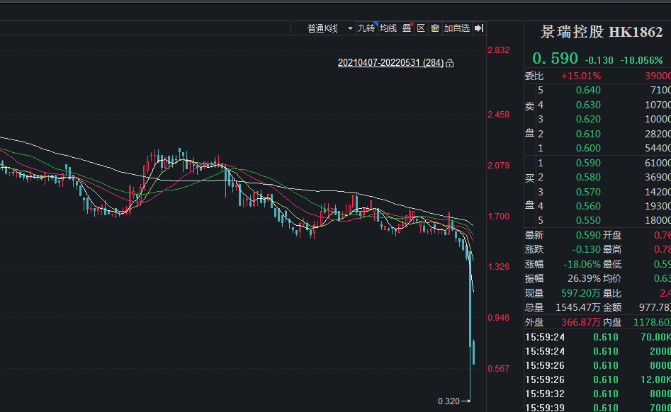 5月31日,景瑞繼續保持下跌趨勢,截止今日收盤,景瑞控股下跌18.06%,成交量1545萬,成交金額978萬。