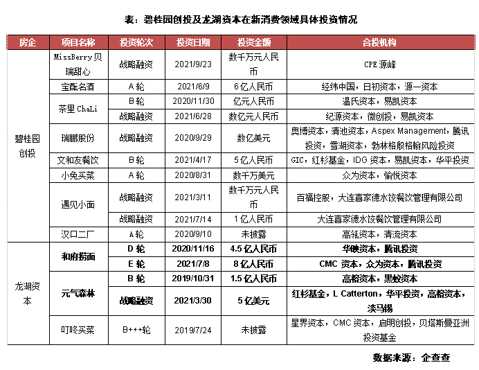 在眾多房企背景的投資機(jī)構(gòu)中,碧桂園創(chuàng)投及龍湖資本在新消費(fèi)領(lǐng)域布局較為深入。其中碧桂園創(chuàng)投成立于2019年1月,為碧桂園集團(tuán)的直屬股權(quán)投資事業(yè)部,主要負(fù)責(zé)集團(tuán)除地產(chǎn)投資以外的股權(quán)投資業(yè)務(wù),新消費(fèi)領(lǐng)域?yàn)楸坦饒@創(chuàng)投的四大投資主題之一。目前,碧桂園創(chuàng)投已投資了餐飲品牌遇見小面、文和友,茶酒品牌漢口二廠、茶里、貝瑞甜心、寶醞名酒,美妝品牌可糖、林清軒等等。