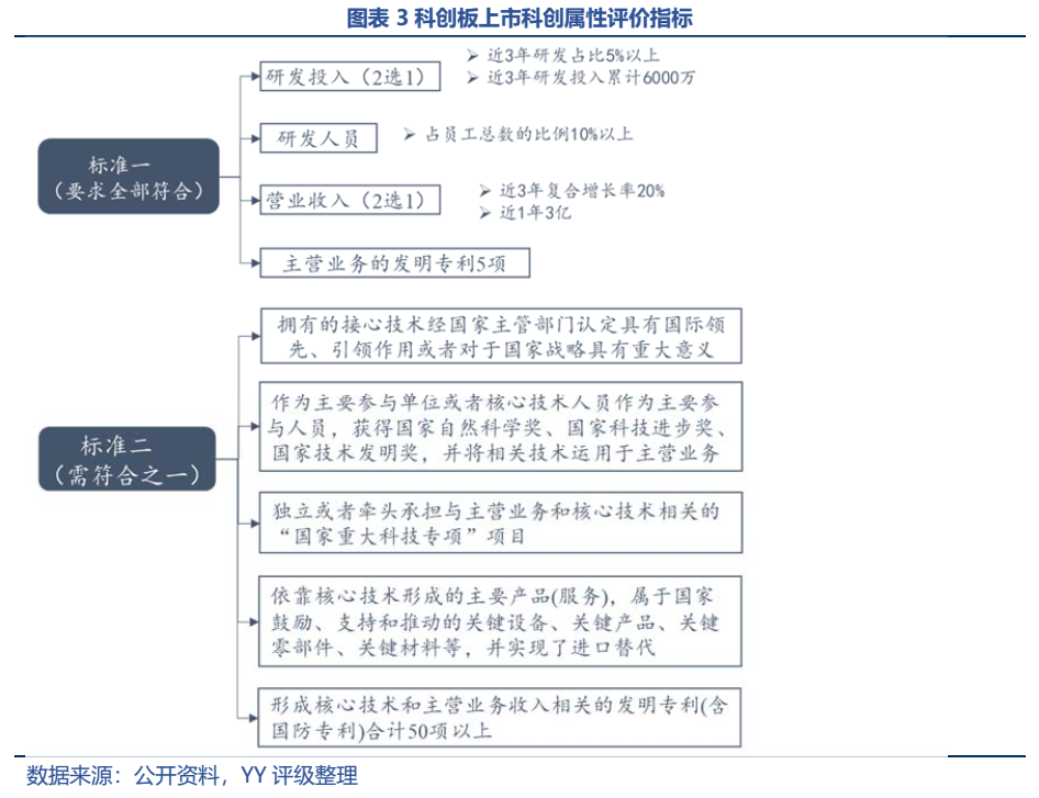 科創屬性指標方面,科創板設置了兩套標準,只要滿足其一即可。