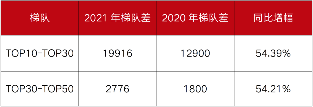 表:2021-2020年各梯隊企業在管門檻值梯隊差對比(萬平方米)