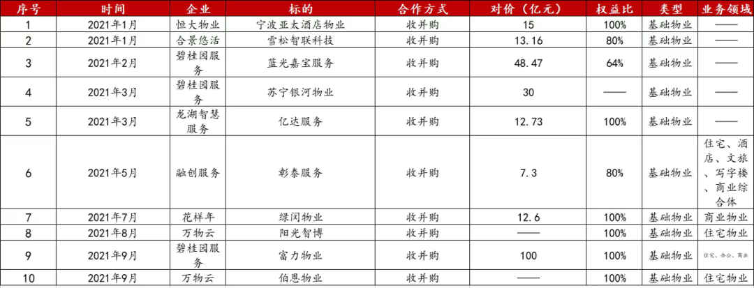 年內,碧桂園服務、萬物云、世茂服務、金科服務等多家企業不斷出手優質標的,高交易額、高頻次;并刷新業內最貴收購單價記錄(碧桂園服務更是斥資百億收購富力物業);亦出現“小吃大”的經典案例,合景悠活拿出1/3募資額收購斥資13.6億收購雪松智聯。