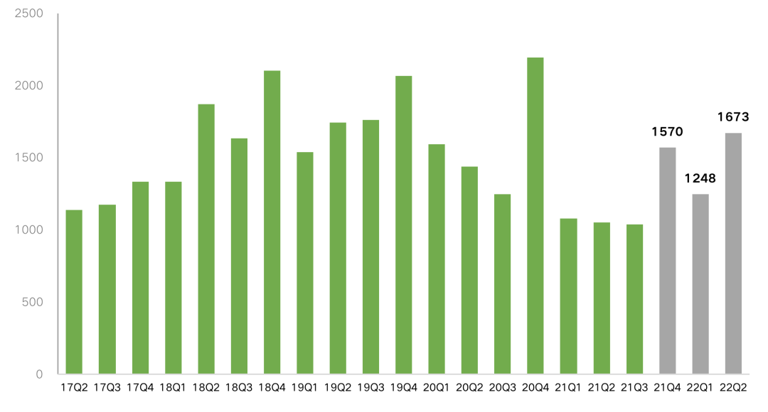 信托方面來看,根據信托業協會2021年中期公布的全行業未來一年信托到期規模分布的官方數據,假定以房地產資金信托余額占比來估計房地產信托到期規模占比,今年四季度房地產信托到期規模1570億元,明年一季度到期1248億元,二季度到期1673億元,每季度平均到期規模接近1500億元。