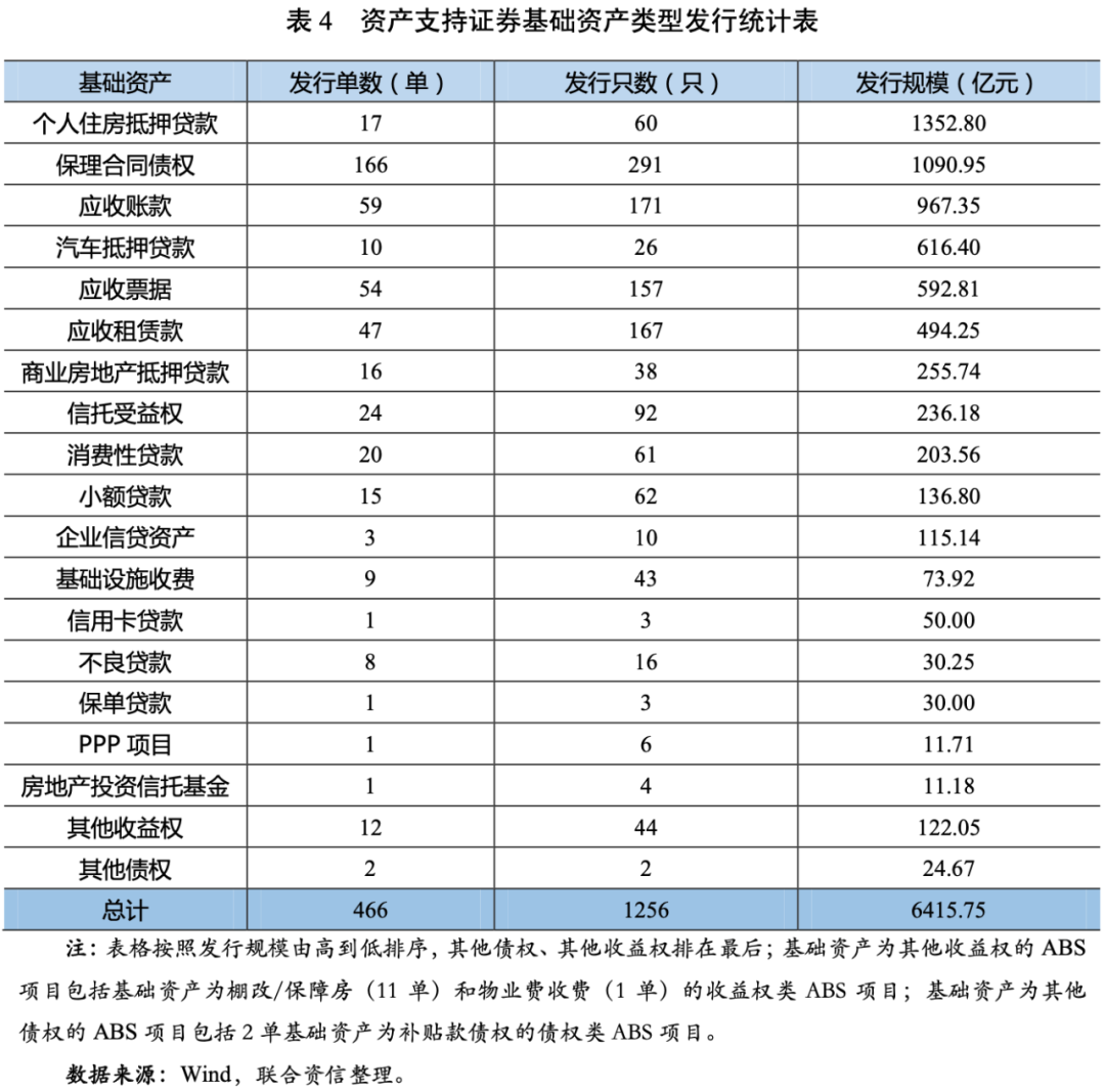 按照基礎(chǔ)資產(chǎn)類(lèi)型統(tǒng)計(jì),2021年一季度,個(gè)人住房抵押貸款(1352.80億元)、保理合同債權(quán)(1090.95億元)、應(yīng)收賬款(967.35億元)、汽車(chē)抵押貸款(616.40億元)、應(yīng)收票據(jù)(592.81億元)均超過(guò)500億元,是發(fā)行規(guī)模最大的五類(lèi)基礎(chǔ)資產(chǎn);從發(fā)行單數(shù)看,保理合同債權(quán)(166單)、應(yīng)收賬款(59單)、應(yīng)收票據(jù)(54單)、應(yīng)收租賃款(47單)和信托受益權(quán)(24單)排名前五位(見(jiàn)表4)。
