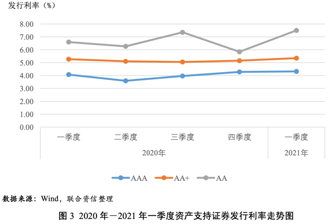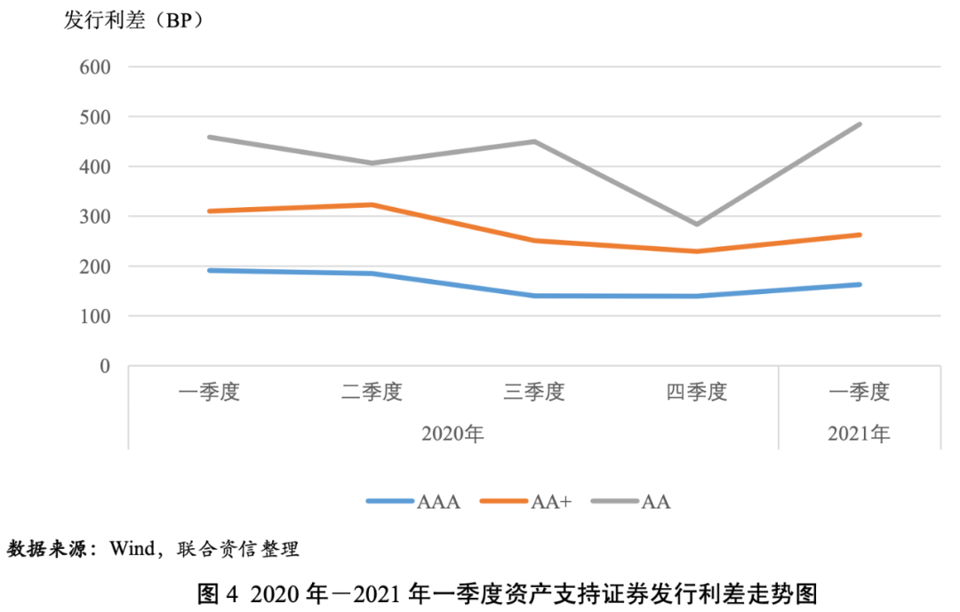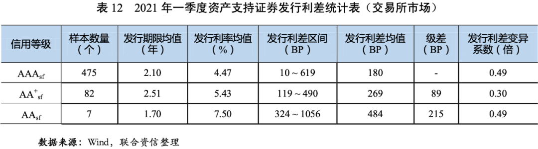 2021年一季度,資產(chǎn)支持證券的發(fā)行利率和利差均值均隨信用等級(jí)的下降而上升,說(shuō)明信用評(píng)級(jí)對(duì)資產(chǎn)支持證券的信用風(fēng)險(xiǎn)具有較好的區(qū)分度。AAAsf、AA+sf和AAsf級(jí)資產(chǎn)支持證券的發(fā)行利差均值分別為163BP、262BP和484BP,AAAsf、AA+sf和AAsf級(jí)資產(chǎn)支持證券的發(fā)行利差均值環(huán)比分別上升24BP、33BP和201BP;AAAsf級(jí)和AA+sf級(jí)資產(chǎn)支持證券的發(fā)行利差同比分別下降28BP和47BP,AAsf級(jí)資產(chǎn)支持證券的發(fā)行利差同比上升26BP。AAAsf級(jí)和AA+sf級(jí)、AA+sf級(jí)和AAsf級(jí)之間的級(jí)差分別為100BP和222BP,級(jí)差隨級(jí)別的下降而上升,反映了在經(jīng)濟(jì)恢復(fù)不均衡、貨幣政策回歸常態(tài)的背景下,市場(chǎng)不確定性上升,投資者對(duì)低級(jí)別資產(chǎn)支持證券要求的風(fēng)險(xiǎn)溢價(jià)進(jìn)一步提高。AAAsf級(jí)資產(chǎn)支持證券的發(fā)行利差的變異系數(shù)相對(duì)較高,說(shuō)明投資者對(duì)AAAsf級(jí)資產(chǎn)支持證券的信用風(fēng)險(xiǎn)判斷存在分化。