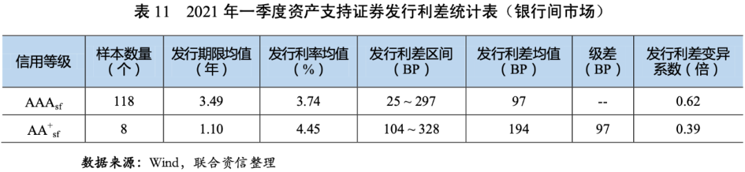 2021年一季度資產(chǎn)支持證券市場(chǎng)增長(zhǎng)較為平穩(wěn),全年共發(fā)行466單1256只資產(chǎn)支持證券,發(fā)行規(guī)模6415.75億元,環(huán)比均有所下降,同比均有所上升,其中銀行間ABS同比增幅較大,表現(xiàn)較為突出。資產(chǎn)支持證券發(fā)行信用等級(jí)主要集中于AAAsf和AA+sf,AAAsf、AA+sf和AAsf級(jí)資產(chǎn)支持證券的發(fā)行利差均值分別為163BP、262BP和484BP,各信用等級(jí)利差檢驗(yàn)具有顯著差異,信用評(píng)級(jí)對(duì)資產(chǎn)支持證券的信用風(fēng)險(xiǎn)具有良好的區(qū)分度。