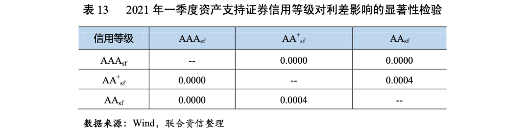 為了檢驗(yàn)信用等級(jí)對(duì)資產(chǎn)支持證券發(fā)行利差影響的顯著性,我們采用了Mann-Whitney U 兩獨(dú)立樣本非參數(shù)檢驗(yàn)方法,對(duì)AAAsf、AA+sf和AAsf級(jí)兩兩之間的利差分布進(jìn)行顯著性檢驗(yàn)。2021年一季度,在95%的置信水平下,AAAsf級(jí)和AA+sf級(jí)、AAAsf級(jí)和AAsf級(jí)之間、AA+sf級(jí)和AAsf級(jí)之間均通過(guò)檢驗(yàn),具有顯著性差異。整體來(lái)看,信用等級(jí)對(duì)發(fā)行利差具有區(qū)分性,評(píng)級(jí)結(jié)果得到了投資者認(rèn)可(表13)。
