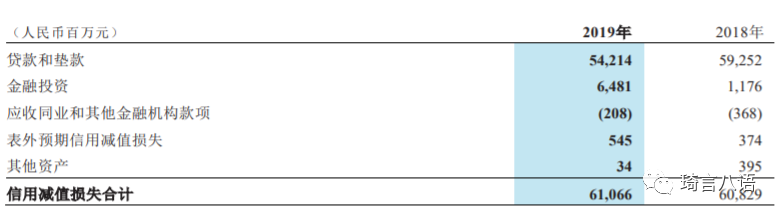 以招行為例,下圖是其2019年年報的信用減值損失明細披露,可以發(fā)現(xiàn)貸款和墊款信用減值損失是信用減值損失的最大組成部分,占比達88.78%,但同比下降8.63個百分點,主要是金融投資的信用減值損失同比增加451%。這體現(xiàn)出招行為應對監(jiān)管新規(guī)而主動加大非信貸類資產(chǎn)的計提力度和審慎經(jīng)營的經(jīng)營理念。