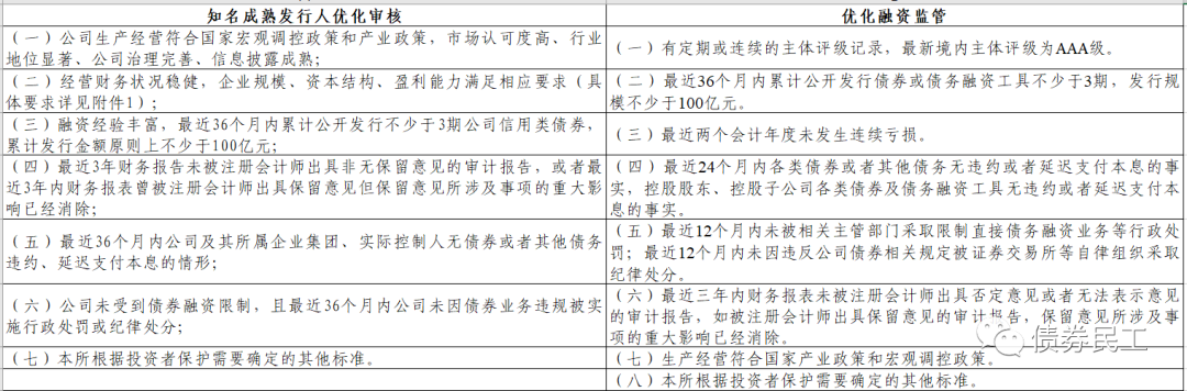 1、《優(yōu)化審核》明確了符合知名成熟發(fā)行人的界定范圍,主要是從財務指標、債券發(fā)行情況等幾個可以量化的指標進行區(qū)分。從設置的指標來看,《優(yōu)化審核》去掉了“最近兩個會計年度連續(xù)發(fā)生虧損”這個指標,這對于部分虧損企業(yè)來說,是非常有利的。其他的條件基礎條件,基本是一致的。