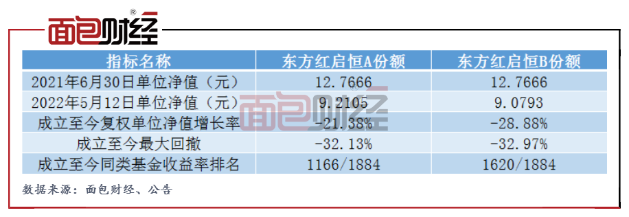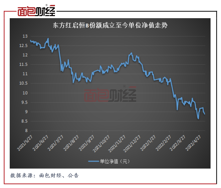 成立至今,東方紅啟恒A、B份額復權單位凈值分別下跌21.38%、28.88%,單位凈值均跌至9元附近。其中B份額的同類基金同期復權單位凈值跌幅平均值僅15.03%,B份額凈值表現在同類1800余只基金產品中排在尾部。