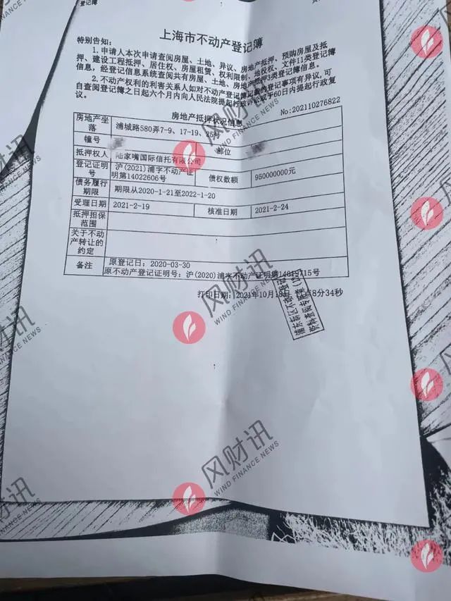 據購房者提供的抵押合同復印件顯示,世茂和陸家嘴國際信托簽訂了一份債權數額9.5億元的房地產抵押合同,債務履行期限為2020年1月21日到2022年1月20日。