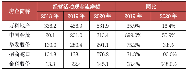 具體來(lái)看,27家房企連續(xù)三年經(jīng)營(yíng)活動(dòng)現(xiàn)金流均保持凈流入的房企資金鏈較為穩(wěn)定,抵御流動(dòng)性風(fēng)險(xiǎn)能力較強(qiáng),同時(shí)降杠桿目標(biāo)也更易達(dá)成。其中萬(wàn)科、金茂、華發(fā)、招商蛇口和金科股份在此基礎(chǔ)上,2019-2020年經(jīng)營(yíng)活動(dòng)現(xiàn)金流凈額保持正增長(zhǎng)。
