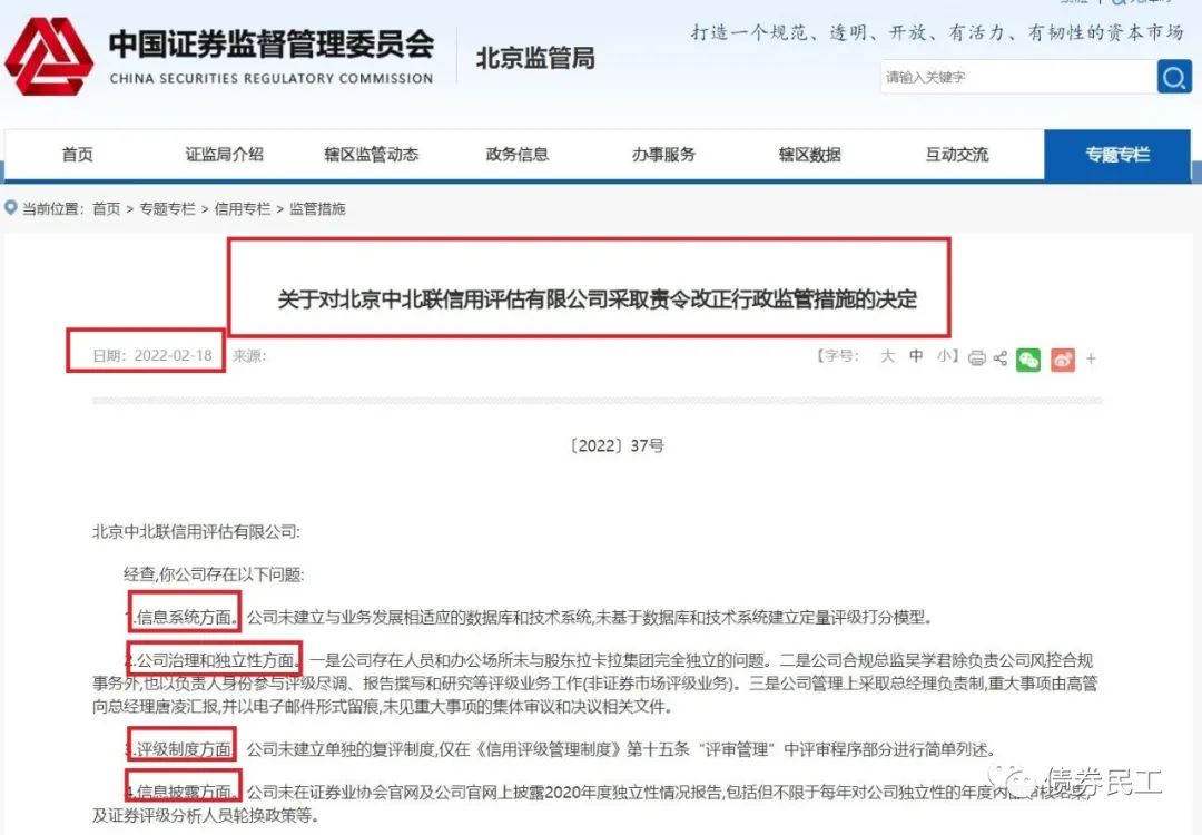 根據(jù)北京證監(jiān)局2022年2月18日披露的《關(guān)于對(duì)北京中北聯(lián)信用評(píng)估有限公司采取責(zé)令改正行政監(jiān)管措施的決定》,因在信息系統(tǒng)方面、公司治理和獨(dú)立性方面、評(píng)級(jí)制度方面、信息披露方面存在問(wèn)題,被采取責(zé)令改正行政監(jiān)管措施。