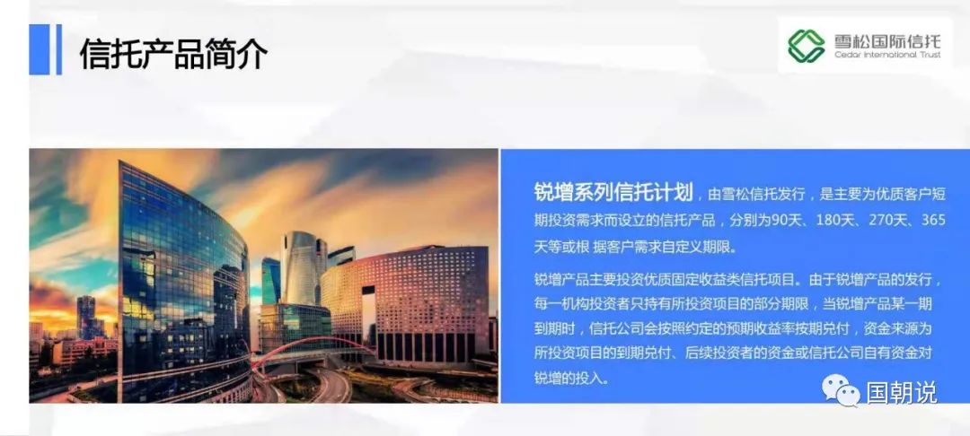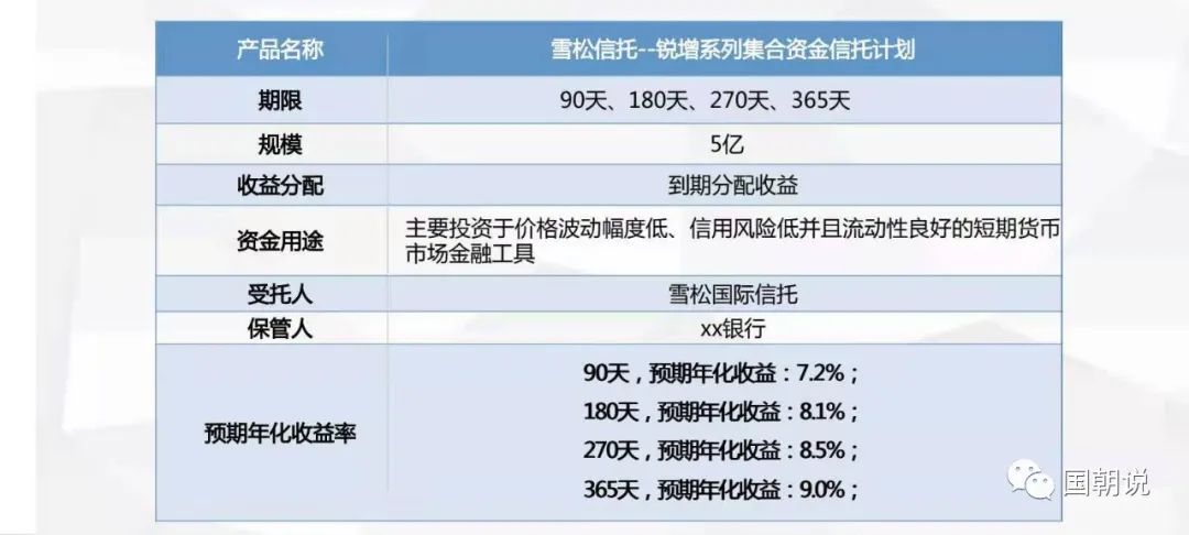 根據(jù)信托公司推介資料顯示,該產(chǎn)品名為銳增系列信托計(jì)劃,由雪松信托發(fā)行,是主要為優(yōu)質(zhì)客戶短期投資需求而設(shè)立的信托產(chǎn)品,分別為90天、180天、270天、365天等或根據(jù)客戶需求自定義期限,預(yù)期收益7.2%-9%。