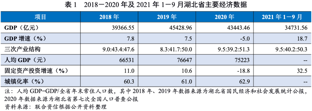 受新冠肺炎疫情影響,2020年湖北省經濟和財政實力明顯下滑,但經濟總量仍居全國中上游,經濟韌性較強。2021年1-9月,隨著新冠肺炎疫情得到控制,湖北省經濟和財政狀況明顯改善。但同時,湖北省經濟發展中存在著傳統產業占比過高,產業調整任務較重,人口增長緩慢,老齡化問題較為突出等問題。近年來,湖北省地方政府債務余額持續增長,政府債務負擔居全國中游水平,整體債務風險較低。