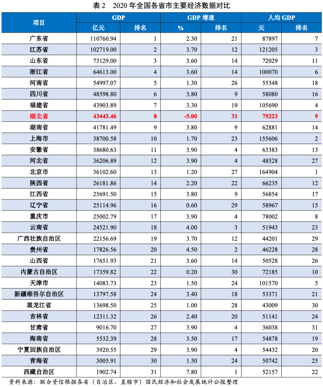 報告概要受新冠肺炎疫情影響,2020年湖北省經濟和財政實力明顯下滑,但經濟總量仍居全國中上游,經濟韌性較強。