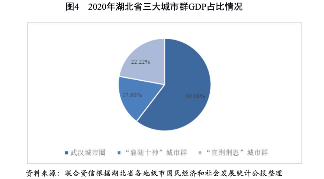 湖北省下轄12個地級市(分別為武漢市、黃石市、十堰市、宜昌市、襄陽市、鄂州市、荊門市、孝感市、荊州市、黃岡市、咸寧市、隨州市)和1個自治州(為恩施土家族苗族自治州(以下簡稱“恩施州”)及4個省直轄縣級行政單位(分別為仙桃市、潛江市、天門市及神農架林區),以下分析以地級市和自治州為主。從區域發展水平看,湖北省各地市州可以分為三個梯隊:第一梯隊為武漢市,其經濟實力和財政實力均明顯高于其他地區;第二梯隊為襄陽市和宜昌市,是湖北省大力發展的兩個省級副中心城市;第三梯隊為其余各地市州,其經濟實力和財政實力均明顯低于上述三個城市。各地市州發展符合湖北省積極推進的“一主兩副、兩橫兩縱、三群聯動、多點支撐”新型城鎮化戰略格局。根據湖北省的發展規劃,省內分為三大城市群,分別是武漢城市圈、“襄隨十神”城市群和“宜荊荊恩”城市群。