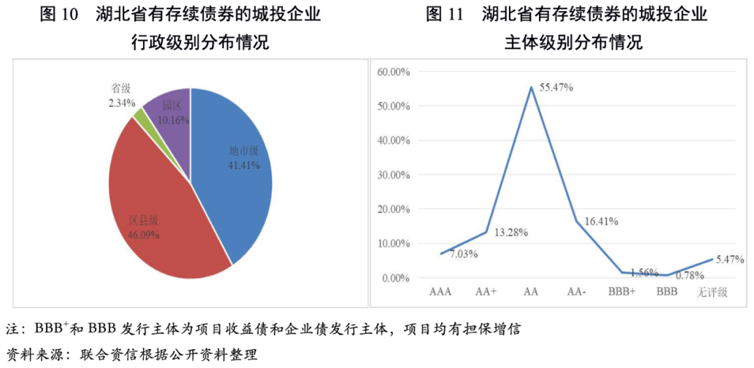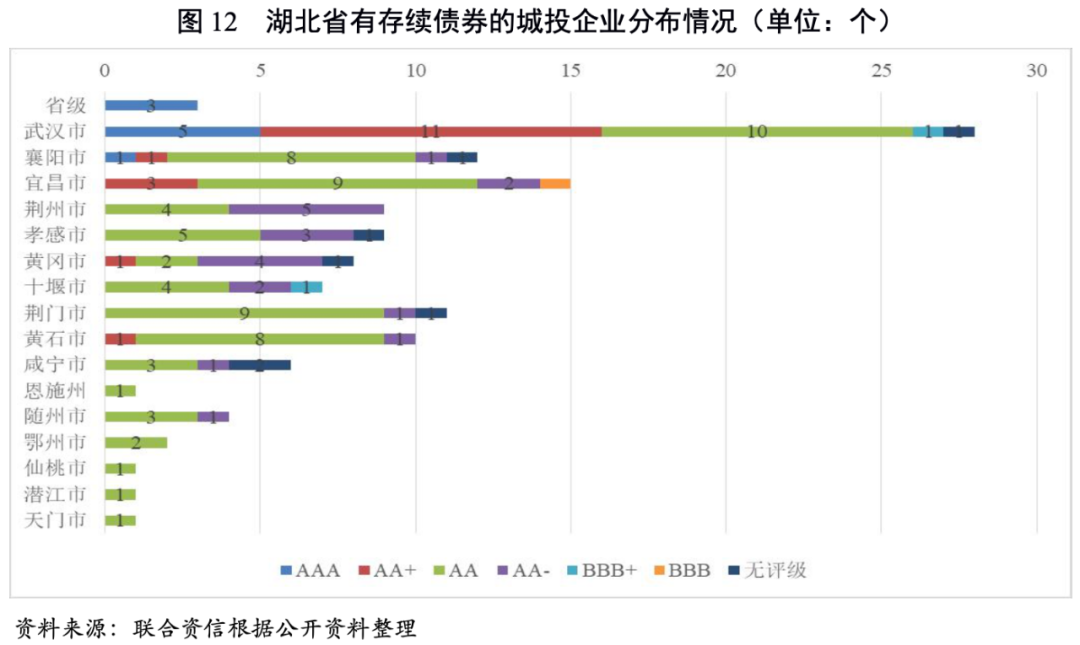 從主體信用級別的分布看,AAA占7.03%、AA+占13.28%、AA占55.47%、AA-占16.41%。AAA城投企業集中在省本級以及經濟實力強的武漢市及襄陽市,AA+城投企業分布在武漢市、襄陽市、宜昌市、黃岡市和黃石市,其他地市州發債城投企業則以AA為主。