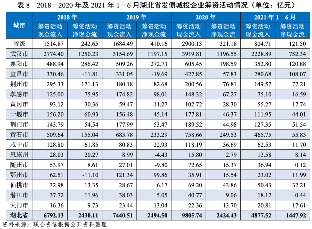 2020年,隨著各項金融支持政策的出臺,湖北省發債城投企業籌資活動現金流入擴大,但孝感市和鄂州市發債城投企業籌資活動現金流入量較上年有所下降;湖北省各地市州發債城投企業籌資活動凈現金流均為正值。2021年1-6月,湖北省各地市州發債城投企業籌資活動現金仍呈凈流入狀態,但隨州市凈流入規模較小,外部籌資僅能滿足債務償還的需要。