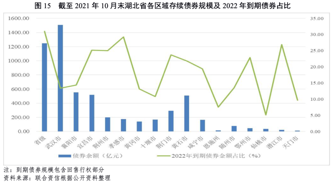 從存續債券看,截至2021年10月末,省本級和武漢市城投企業存續債券規模大,均超過1000.00億元;其次為襄陽市、宜昌市和黃石市,均超過500.00億元;恩施州、隨州市和鄂州市存續債券規模均低于80.00億元。從2022年到期債券占比看,省本級、宜昌市、荊州市、孝感市、荊門市、黃石市和鄂州市占比在20.00%以上,債券到期相對較為集中。
