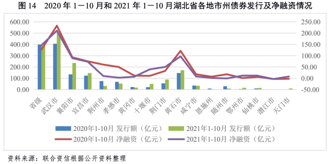 債券發行方面,2021年1-10月,省本級、武漢市、襄陽市、宜昌市和黃石市城投企業債券發行量較大,但省本級、荊州市、孝感市、黃岡市、咸寧市、恩施州和隨州市債券發行量較上年同期有所下降;除隨州市債券融資小幅凈流出外,其他區域債券融資均凈流入。