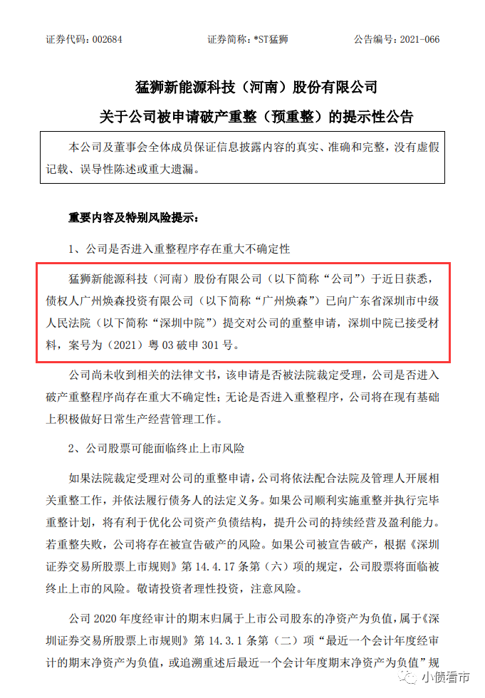 自2018年下半年債務(wù)危機以來,*ST猛獅陸續(xù)發(fā)生債務(wù)逾期,公司部分銀行賬戶、資產(chǎn)被司法凍結(jié),流動資金極為短缺,如今被債權(quán)人申請破產(chǎn)重整。
