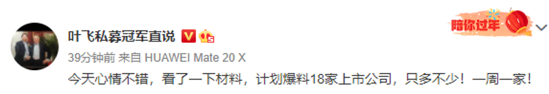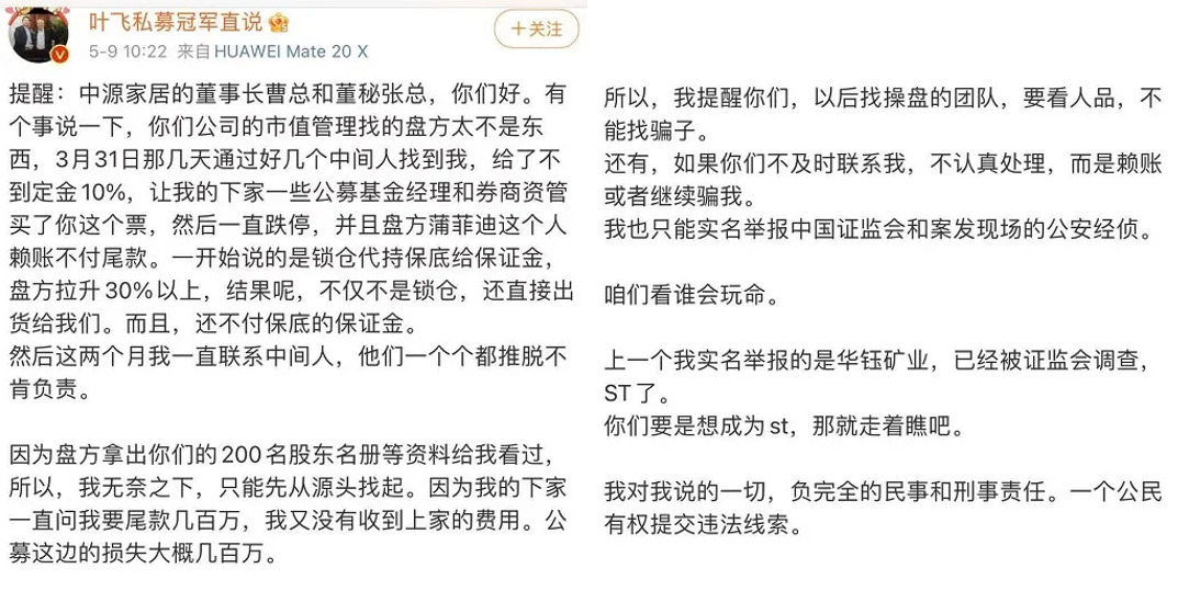 其實早在一個月前,葉飛在微博中就曾表示:“下一個我要實名舉報中源家居,提前給大家預告一下?!?這是葉飛首次公開提到中源家居(603709.SH),并稱會舉報更多欺騙他、讓他損失過的上市公司。