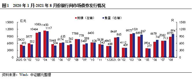 2021年8月,我國銀行間市場共發行信用債券994只,發行規模8,770.13億元,環比分別上升39%和23%,同比分別上升28%和13%。綜合1-8月來看,銀行間市場發行信用債券6,109只,發行規模57,977.11億元,比2020年同期發行數量和規模分別上升7%和下降0.3%。