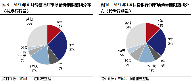 期限方面,8月銀行間市場債券期限集中度同比下降,主要期限的發行規模占比較7月上升。