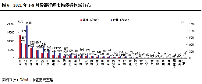 2021年8月份,銀行間市場債券廣泛分布于29個省(直轄市、自治區)。從發行規模來看,北京以1,770.91億元的發行規模遙遙領先,江蘇、廣東、山東、上海和浙江位列第二梯隊,發行規模在500-1,500億元之間。從發行數量來看,江蘇排名第一、北京排名前二,山東、浙江、廣東、上海發行數量緊隨其后,均超過40只。綜合2021年1-8月的情況來看,銀行間市場債券的發行主導區域仍集中在北京、江蘇和廣東等地區。從發行規模來看,北京以1,3430.15 億元的發行規模領先于其他省市,江蘇、廣東和上海緊隨其后。從發行數量來看,江蘇發行1,438只,位居第一;北京發行678只,位居第二;廣東發行522只,位列第三。