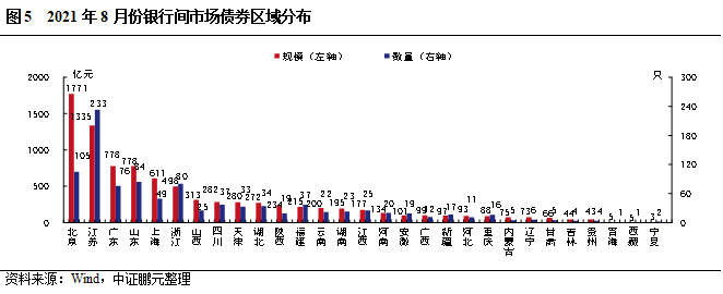 區域分布方面,8月銀行間市場債券發行人主要分布在北京及東部沿海地區,北京以1,770.91億元位居發行規模第一位;8月表現為凈融資省份共23個,江蘇、山東、廣東分別以凈融資508.09億元、425.42億元、183.60億元排名前三位。其中,共有7個省份呈凈償還,區域主要分布在北方地區和重慶。